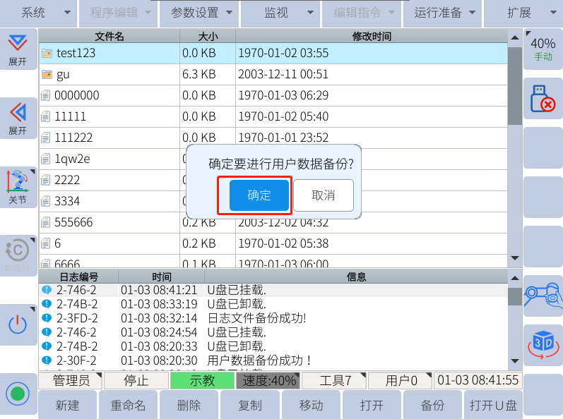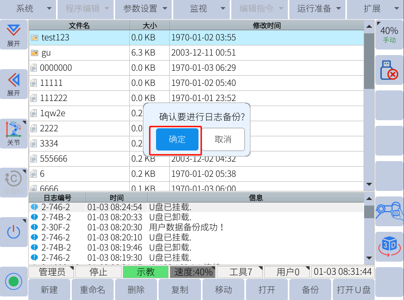 在u盤插好的情況下,點(diǎn)擊:系統(tǒng)--文件備份--日志備份--確認(rèn)