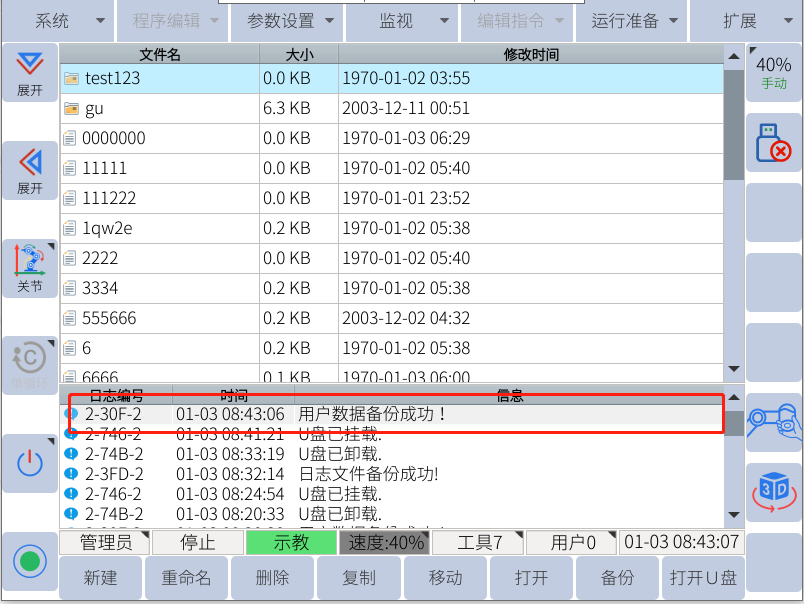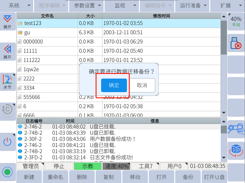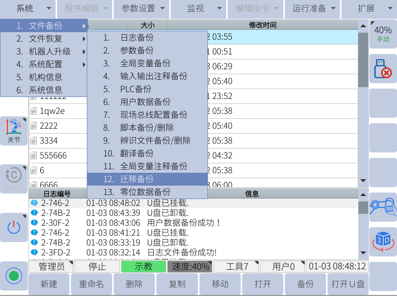 遷移備份一般在需要更換控制柜的情況下使用,會(huì)備份出所有的機(jī)器人文件包括機(jī)器人的零位dh等,需要注意不能和用戶數(shù)據(jù)備份弄混!