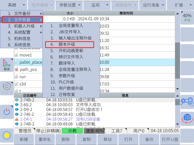 注:只有示教器上顯示u盤圖標(biāo)的時(shí)候才能用來備份和恢復(fù)(導(dǎo)入導(dǎo)出相關(guān)數(shù)據(jù))