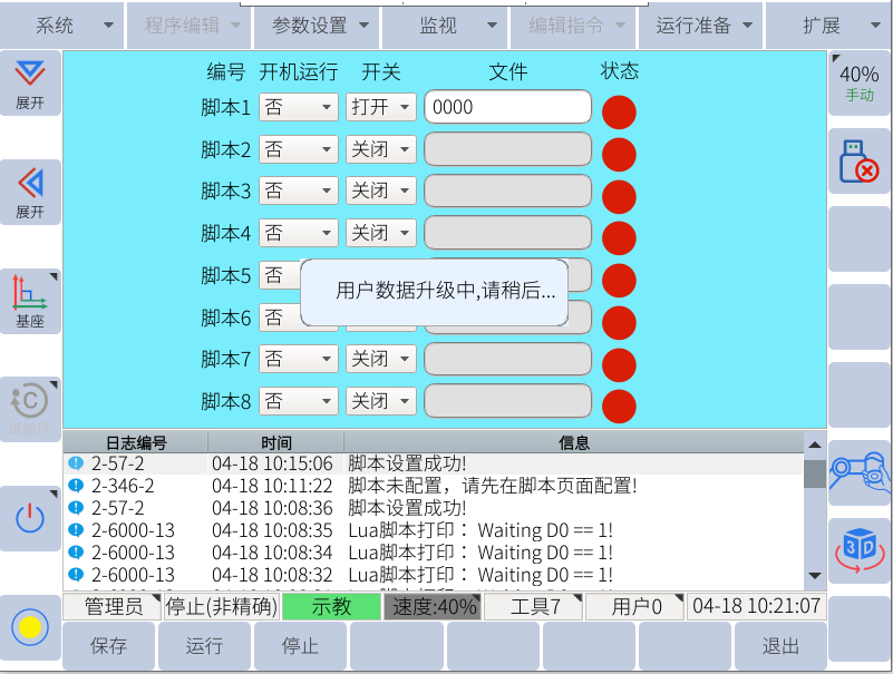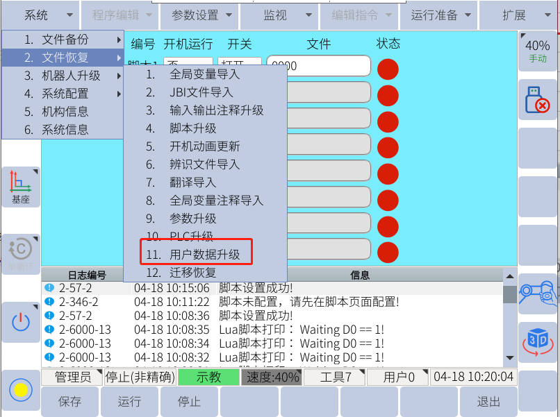 用戶數(shù)據(jù)恢復(fù)可恢復(fù)出所有jbi和lua文件,也包括用戶plc,全局變量及注釋等;一般復(fù)制一臺機(jī)器人應(yīng)用的程序到另一臺機(jī)器人的時(shí)候,可以使用用戶數(shù)據(jù)恢復(fù)(不包含全局變量);