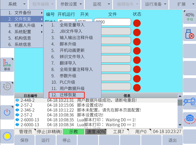 遷移恢復(fù)一般在需要更換控制柜的情況下使用,會(huì)備份出所有的機(jī)器人文件包括機(jī)器人的零位dh等,需要注意不能和用戶數(shù)據(jù)恢復(fù)弄混!否則會(huì)出現(xiàn)丟失零點(diǎn)等不可挽回的問題!(遷移只能在同臺機(jī)器人內(nèi)進(jìn)行,,不同臺機(jī)器人,不能遷移恢復(fù))