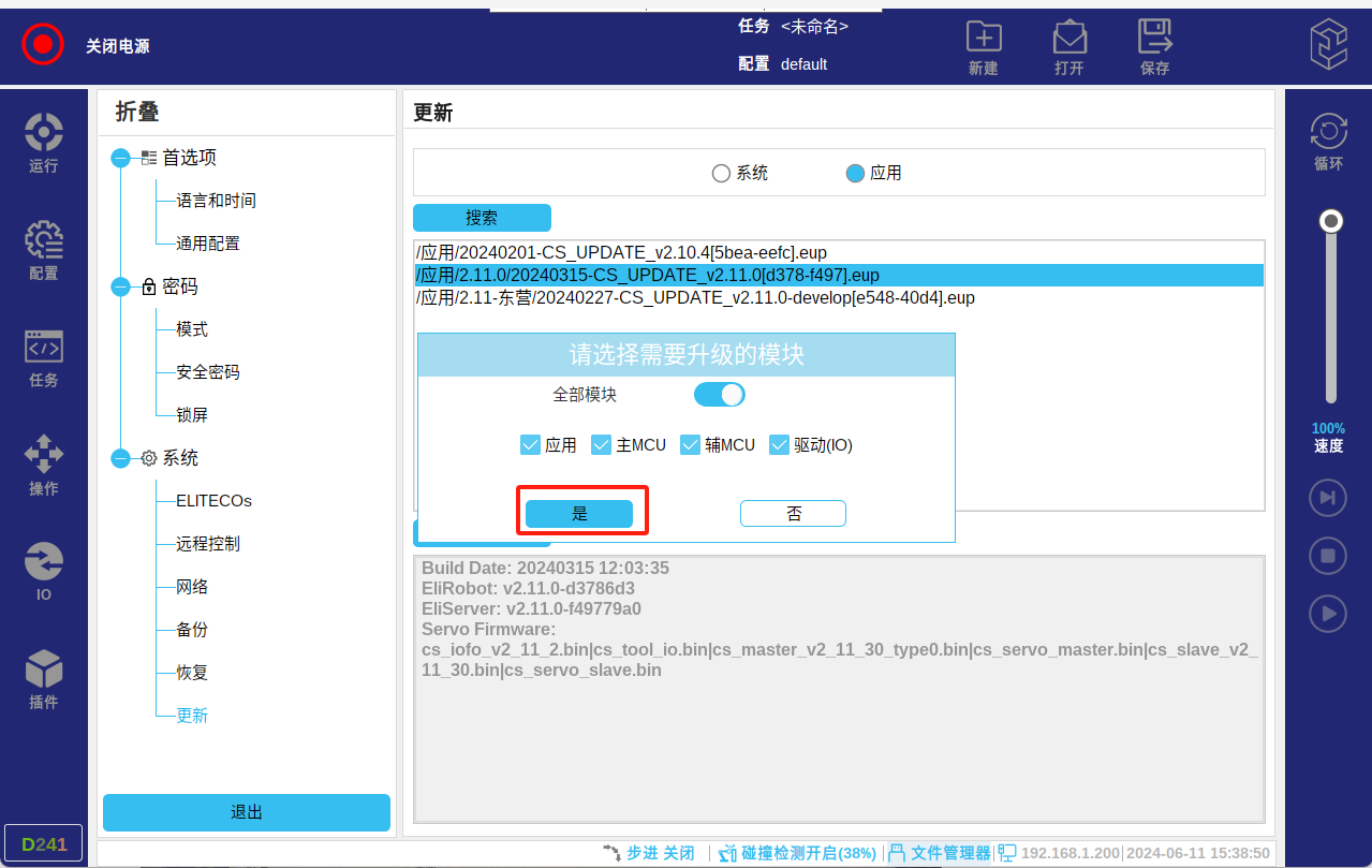 調試階段建議全部勾選進行升級,也可單獨勾選應用升級(應用:系統版本,一般是解決應用軟件的bug和界面優化;MCU: 指伺服升級;驅動IO:指末端IO的升級)。點擊“是”,會自動進行更新系統;請勿操作機器人或將其斷電。等待更新后重啟。
