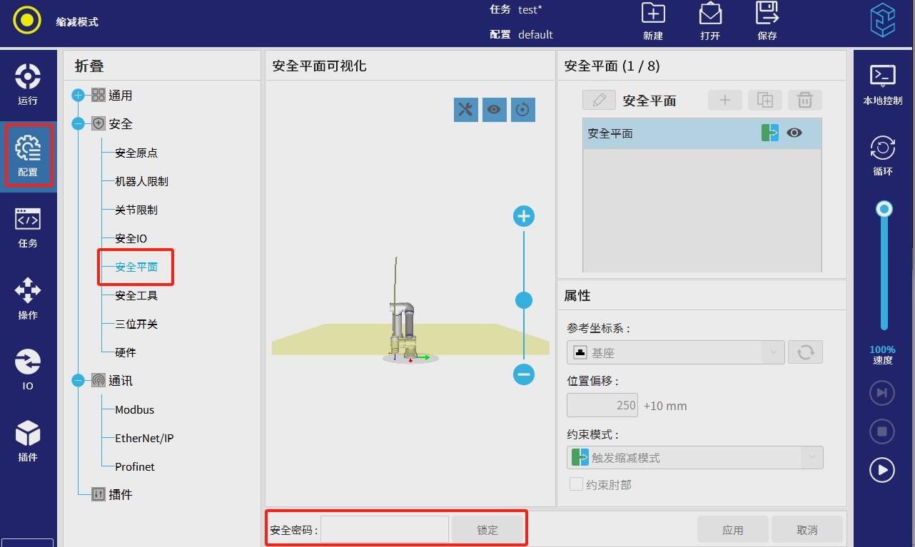4. 選擇好之前建立的坐標系或者基坐標系,通過位置偏移來確定平面位置,該位置偏移是通過增加或者減小該坐標系的Z軸坐標來實現平面位置的偏移。該平面的Z+方向是正常區域,Z-方向是限制區域,機械臂工具中心點到達該平面及該平面Z-方向區域會觸發相應的約束模式,縮減模式或者防護停止。如果機械臂進入防護停止,會自動進入安全恢復模式,手動把機械臂的工具中心點移動到Z+方向上面,機械臂才能再次正常使用。