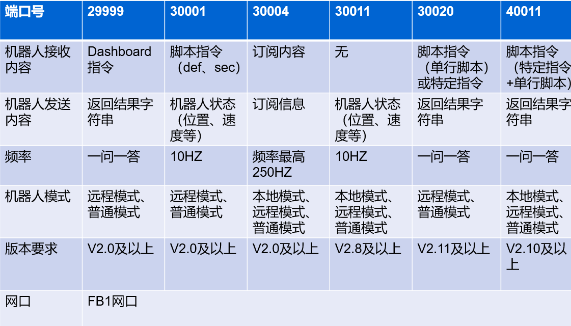 ● 30001和30011端口全數(shù)據(jù)獲取,頻率均為10HZ,區(qū)別30001可以響應(yīng)外部腳本輸入,30011僅用于外部監(jiān)測機(jī)器人狀態(tài),可在任意機(jī)器人模式下獲取。