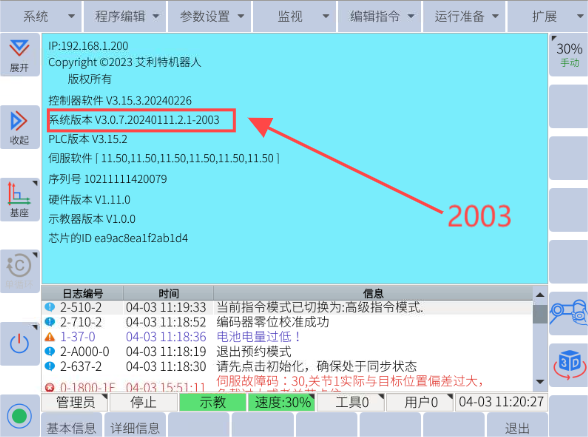 網(wǎng)頁(yè)版示教器適用的控制柜主板版本為“-2003”款的版本,如果是“-1000”款的版本,是無(wú)法連接網(wǎng)頁(yè)版示教器的。查看方式:系統(tǒng)-----系統(tǒng)信息-----詳細(xì)信息-----系統(tǒng)版本號(hào)后綴。如圖: