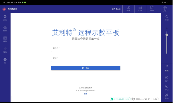 (4)進(jìn)入網(wǎng)頁(yè)版示教器登錄界面后,輸入用戶名和密碼,點(diǎn)擊登錄即可進(jìn)入網(wǎng)頁(yè)版示教器的操作界面。