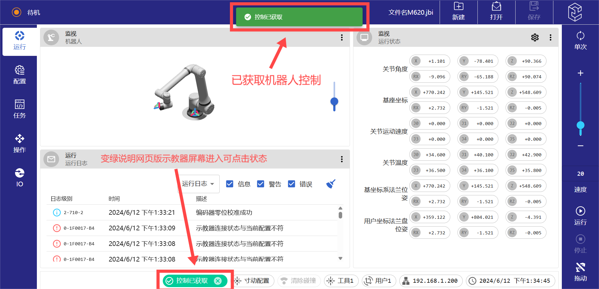 (5)進(jìn)入網(wǎng)頁(yè)版示教器后,和另外兩種方法一樣,先點(diǎn)擊下方菜單欄里面的獲取控制按鍵,等待獲取控制按鍵從白色變?yōu)榫G色后,即可操作網(wǎng)頁(yè)版示教器上面的操作界面。