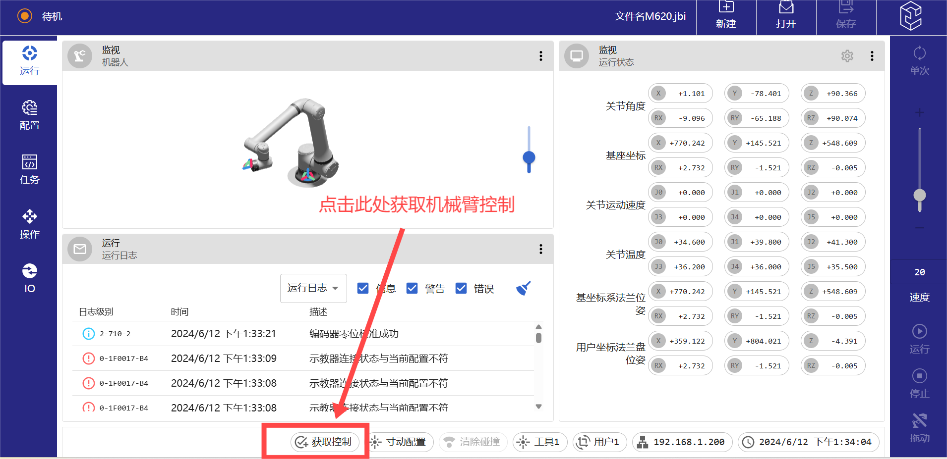 (6)進(jìn)入操作界面后先點(diǎn)擊下方菜單欄里面的“獲取控制”,等獲取控制按鍵從白色變?yōu)榫G色,即可獲取機(jī)械臂的操作權(quán)。