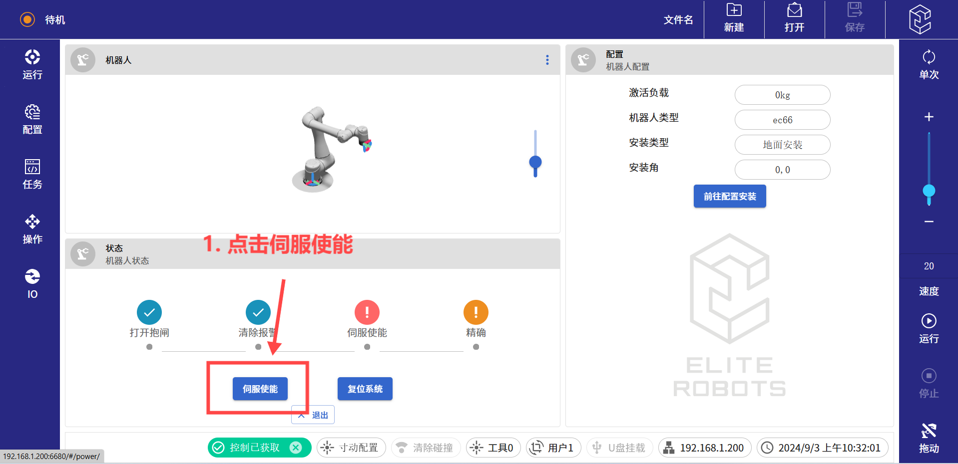 (8)進(jìn)入待機(jī)界面后,依次點(diǎn)擊打開(kāi)抱閘,伺服使能,以及精確。如果使用的是迷你控制柜,第一步還有一個(gè)機(jī)械臂上電的按鈕,點(diǎn)擊上電按鈕繼續(xù)往下執(zhí)行即可。