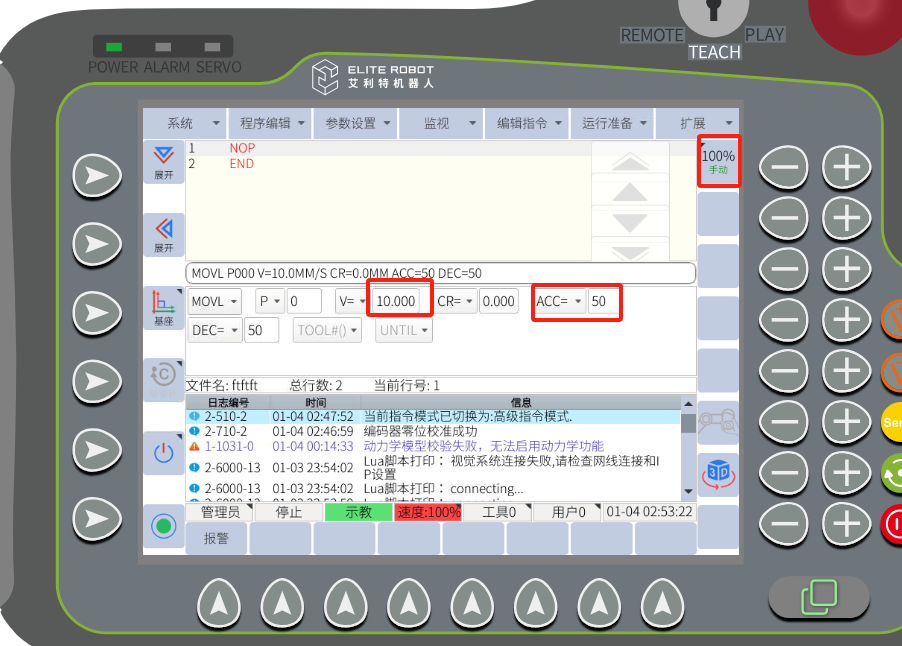 (2):提高機械手運動指令的速度,加速度,整體運行倍率 建議最大速度: