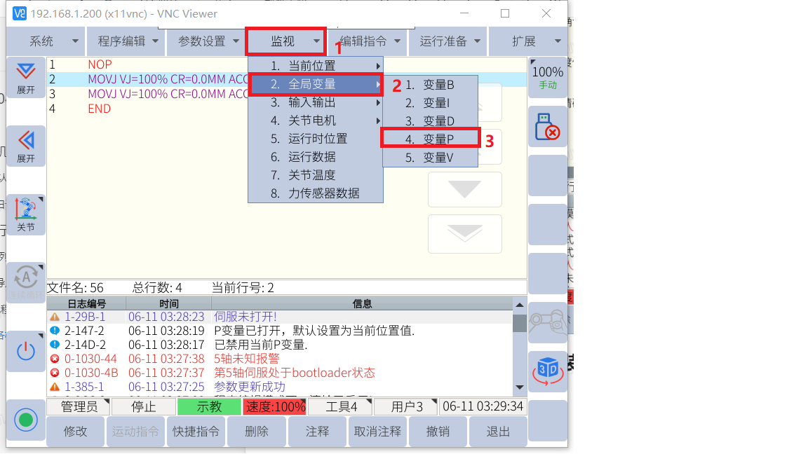 可以用p變量里輸入6個關節角度回打包位,如下圖步驟選用一個未使用的P變量并打開。根據圖片標簽步驟執行。