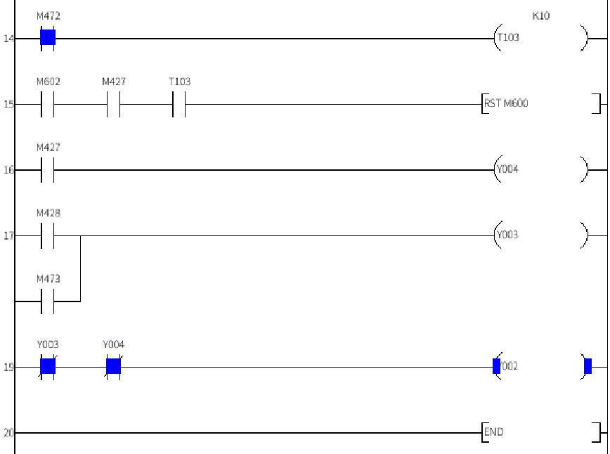 第 15 行:M602有信號,M427(運行狀態)有信號且T103計時到達復位M600。